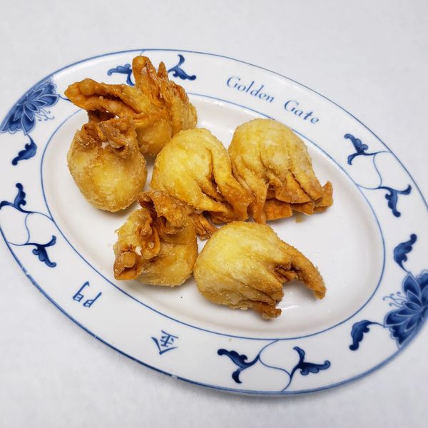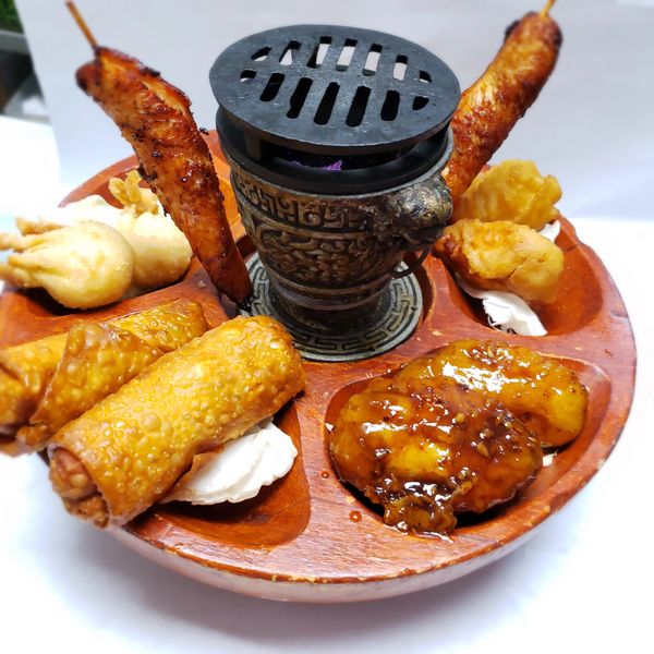 Sampler platter including house-made egg roll, fried shrimp, fried wonton, garlic chicken wing, crab angel, and teriyaki chicken stick