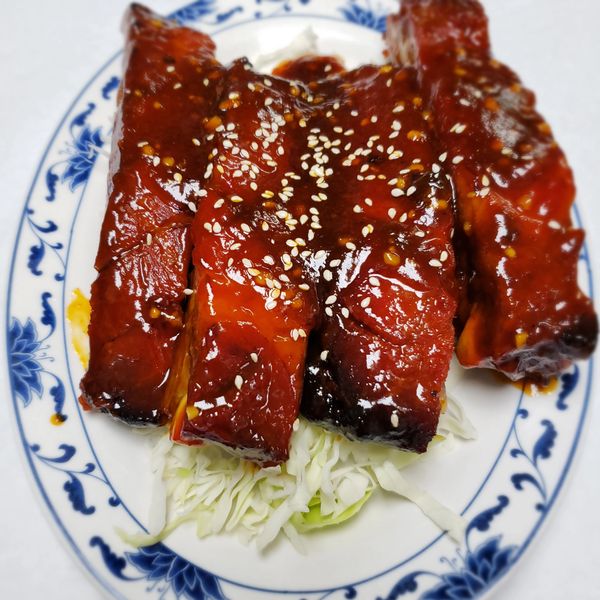 Sliced roasted BBQ pork in house sauce garnish with cabbage and sesame seeds